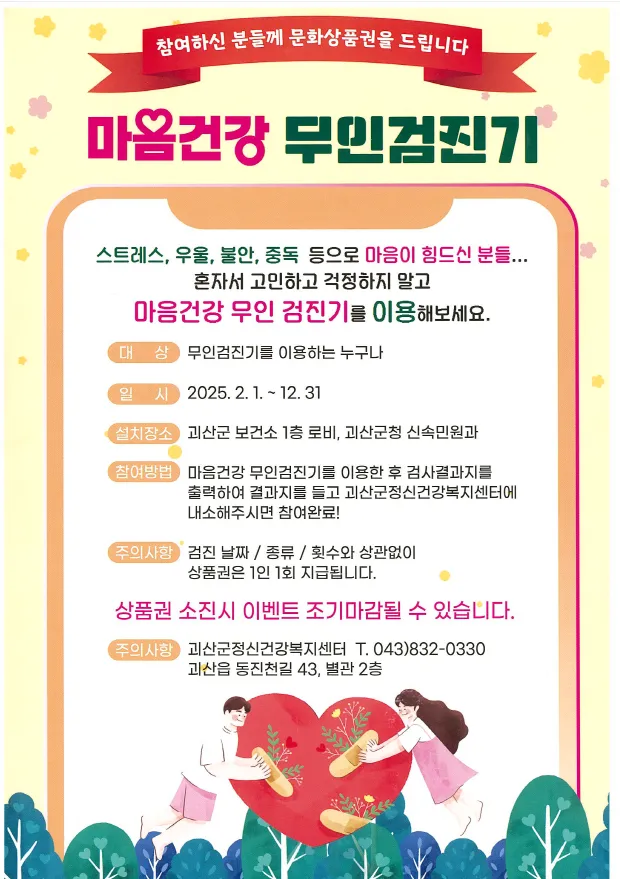 마음건강 무인검진기를 이용한 후 검사결과지를 출력하여 결과지를 들고 괴산군정신건강복지센터에 내소해주시면 참여완료!