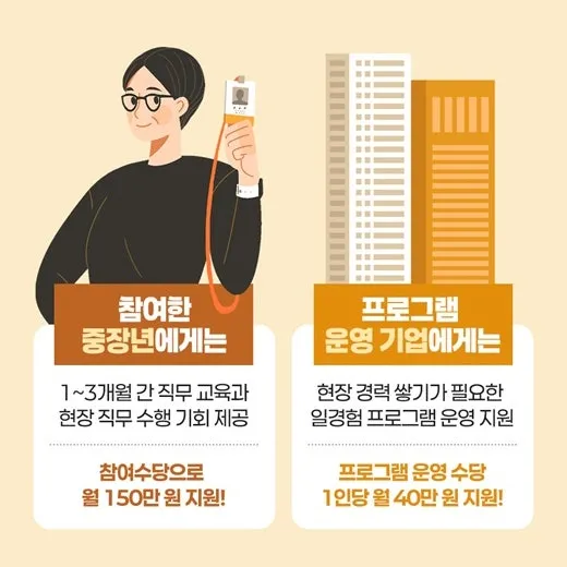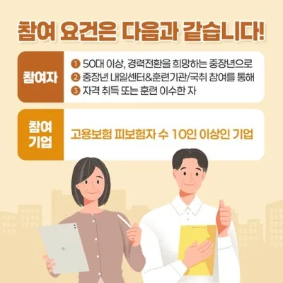 ① 50대 이상, 경력전환을 희망하는 중장년으로 ② 중장년 내일센터&훈련기관/국취 참여를 통해 ③ 자격 취득 또는 훈련 이수한 자 |