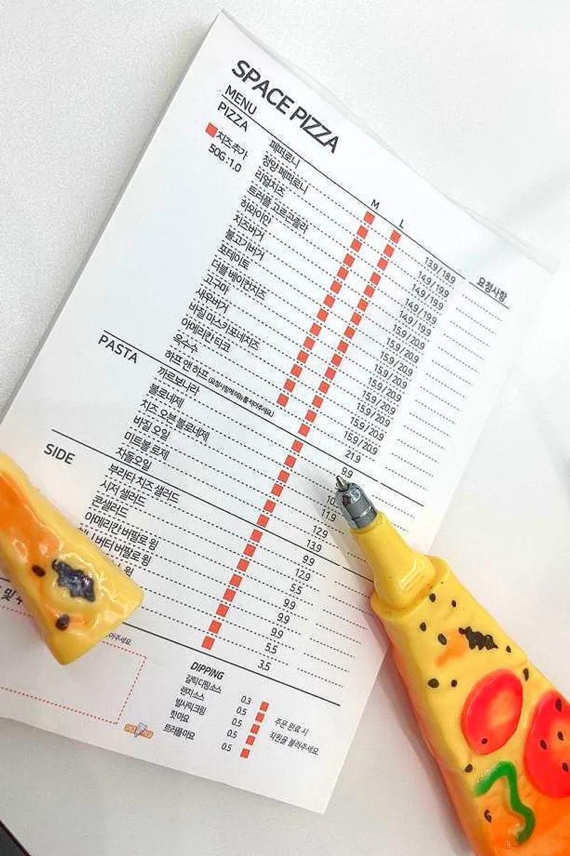 메뉴를 주문하려고 메뉴지를 들고 함참을 볼펜을 찾으니 피자 모형이 볼펜입니다.