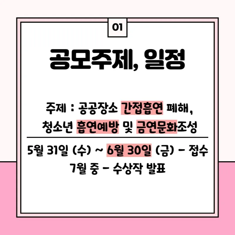 공공장소 간접흡연 폐해와 청소년 흡연예방 및 금연문화 조성을 주제로 한 공모전입니다.