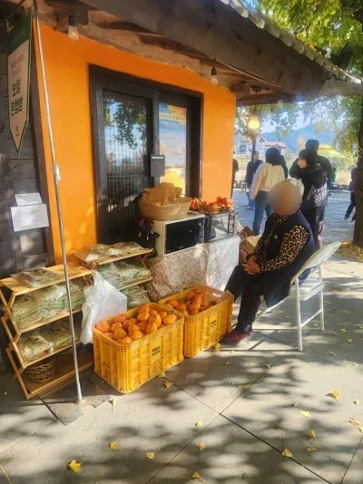 맛있게 보니는 대봉감을 판매하는 마을 어르신의 미소가 푸근하여