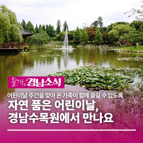 자연 품은 어린이날 , 경남수목원에서 만나요 - 5 월 3 일부터 6 일까지 4 일간 어린이 체험 프로그램 제공 - 가정의 달을 맞아 잔디원 개방 및 다양한 전시 행사 진행 경상남도산림환경연구원 ( 원장 강명효 ) 은 어린이날을 맞아 5 월 3 일부터 6 일까지 4 일간 경상남도수목원에서 어린이를 위한 다양한 체험 프로그램을 운영한다고 밝혔다 . 이번 어린이 체험 프로그램은 ▵ 플라잉 나비 꾸미기 (400 명 ) ▵ 곤충 만들기 (400 명 ) 를 비롯해 , 어린이날 당일인 5 월 5 일에는 ▵ 숲속 컬링...