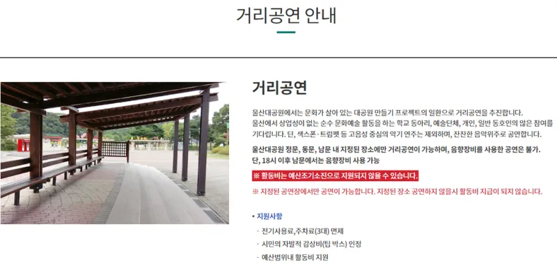문서위치 거리공연 거리공연 안내 거리공연 안내 거리공연 안내 시작 거리공연 울산대공원에서는 문화가 살아 있는 대공원 만들기 프로젝트의 일환으로 거리공연을 추진합니다. 울산에서 상업성이 없는 순수 문화예술 활동을 하는 학교 동아리, 예술단체, 개인, 일반 동호인의 많은 참여를 기다립니다. 단, 색스폰·트럼펫 등 고음성 중심의 악기 연주는 제외하며, 잔잔한 음악위주로 공연합니다. 울산대공원 정문, 동문, 남문 내 지정된 장소에만 거리공연이 가능하며, 음향장비를 사용한 공연은 불가. 단, 18시 이후 남문에서는 음향장비 사용 가능 ※ 활...