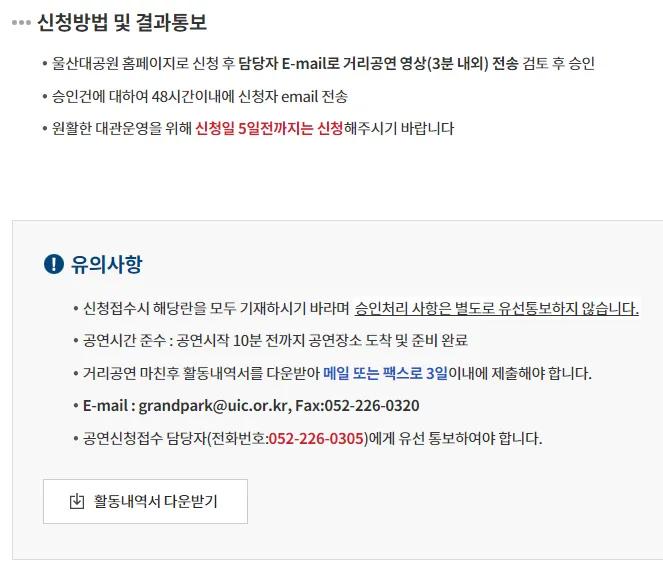 울산시설관리공단에서 관리하는 버스킹 장소인 울산대공원 거리공연도 마찬가지로, 위 사이트 접속 후 신청서 작성 후 담당자 유선 전화로 신청 사항 말씀드린 후, 추후 승인통보 받으시는 절차입니다.👌