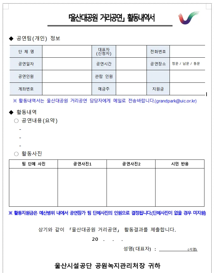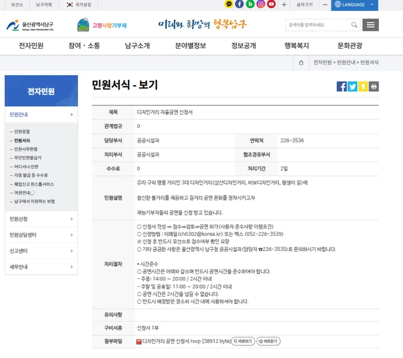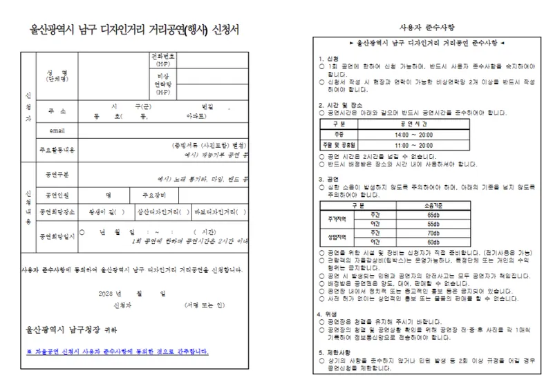 울산 남구청 홈페이지-전자민원-민원서식-공공시설과-디자인거리 자율공연 신청서 클릭 후 아래 신청서를 작성하시면 됩니다.