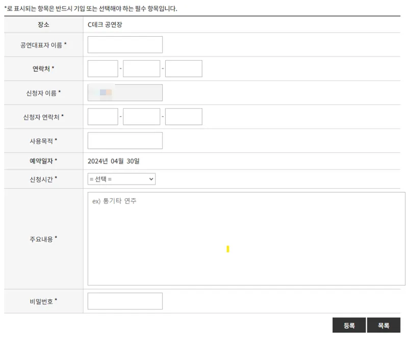 인증을 하고나면 이렇게 공지사항에서 봤던 소공연장 사용 안내 및 주의사항이 나타나고, 제일 아래에 공연신청 정보를 입력할 수 있는 란이 보인답니다. 공란를 모두 채워서 등록버튼을 누르면 소공연장 예약신청 끗👏👏👏