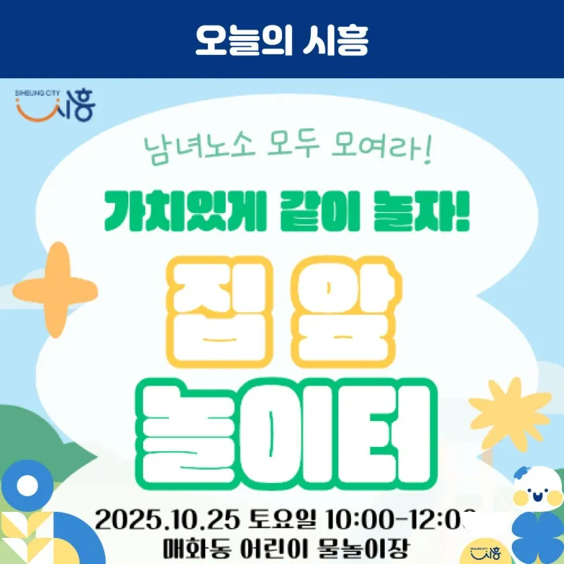 시흥시는 오는 10월 25일 오전 10시부터 12시까지 매화동 어린이 물놀이장(매화동 복지회관 뒤편(매화동 205-3))에서 ‘집앞 놀이터’ 프로그램을 운영합니다.