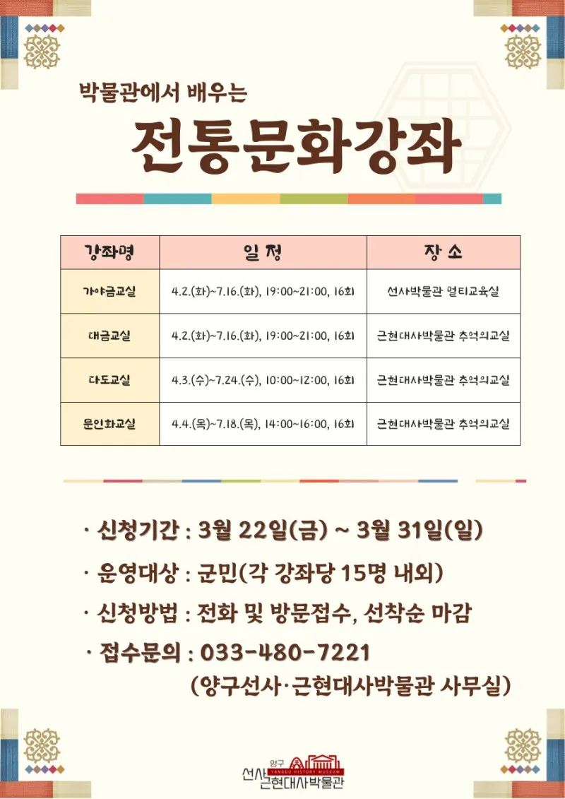 양구 선사근현대사박물관 전통문화강좌 수강생 모집해요!