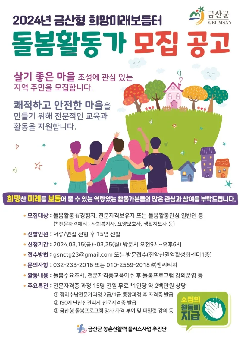 금산군, 2024년 금산형 희망미래보듬터 돌봄활동가 모집 공고 안내