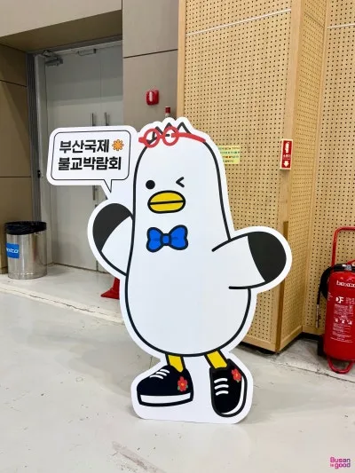 입장 팔찌를 착용하고 전시장에 들어서면, 부산의 대표 마스코트 ‘부기’가 반갑게 맞이해주며 현장 분위기를 밝게 물들였습니다.