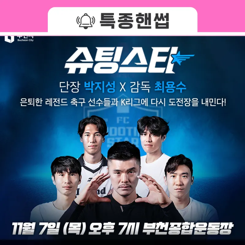11월 22일(금) 저녁 8시에 공개될 쿠팡플레이 예능 ‘슈팅스타’는 은퇴한 레전드 스타 플레이어들이 박지성 단장, 최용수 감독과 함께 한 팀으로 모여 다시 한 번 그라운드의 주인공으로 나서는 성장 축구 예능입니다🥅 |