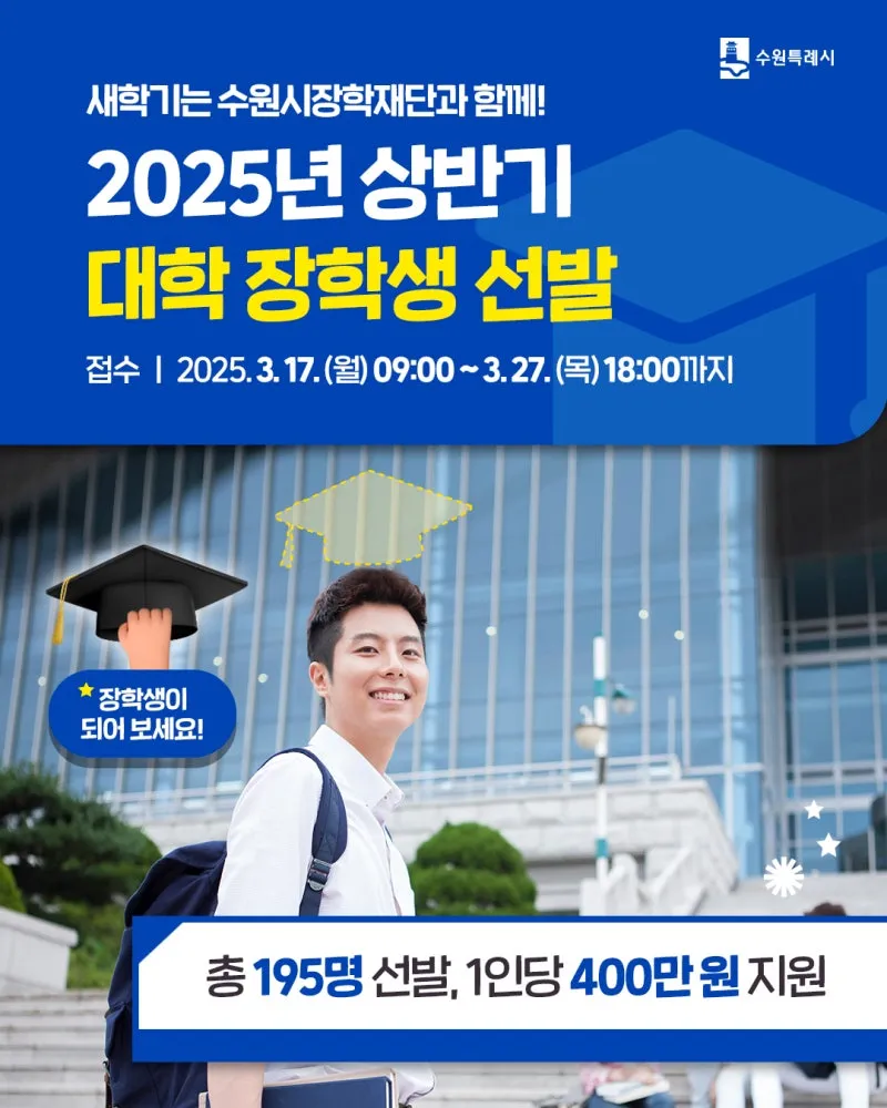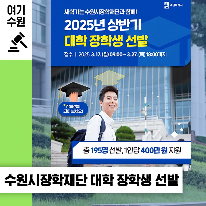 따스한 3월, 새학기가 시작되었는데요. 매학기 돌아오는 대학 등록금의 부담을 줄여드리고자 수원시장학재단이 '2025년도 상반기 대학 장학생 선발'을 시작합니다! 총 195명에게 1인당 400만 원을 지원해 드리니 이번 장학생 선발에 꼭 신청해 보시길 바랍니다.