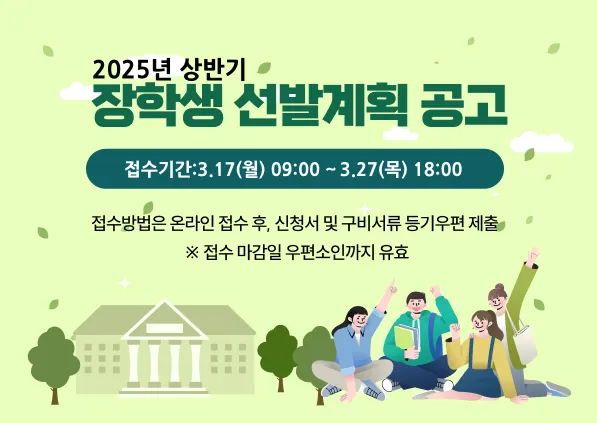- 장학생 서류 접수 : 2025. 3. 17. (월) 9:00 ∼ 3. 27. (목) 18:00까지