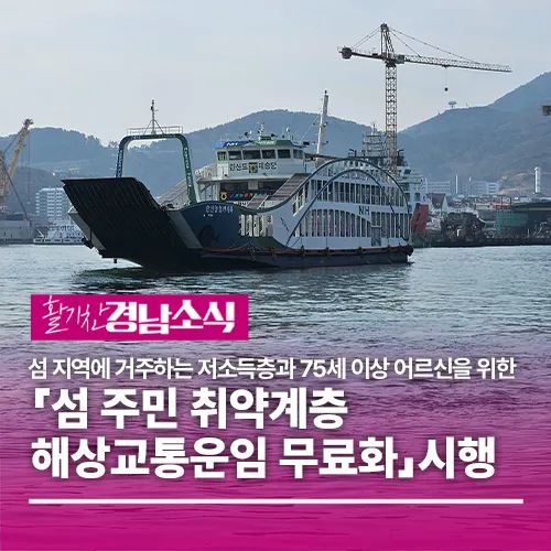 경상남도는 17일부터 섬 지역에 거주하는 저소득층(기초생활수급자, 차상위계층)과 75세 이상 어르신(이하 ‘섬 주민 취약계층’)을 대상으로 ‘섬 주민 해상교통운임 무료화 지원사업’을 시행합니다.