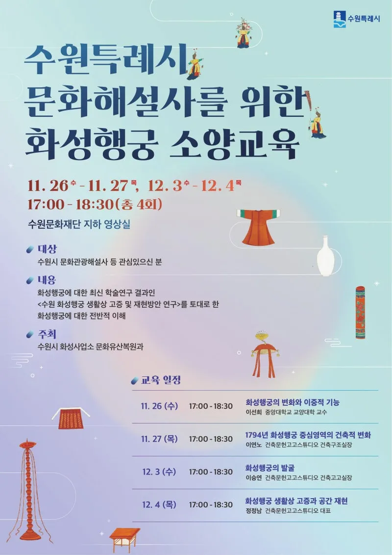 화성행궁에 대한 최신 학술연구 결과를 토대로 한 소양 교육이 진행됩니다. 수원시 문화해설사 등 관심있는 일반 시민 여러분들의 많은 관심과 참여 바랍니다.