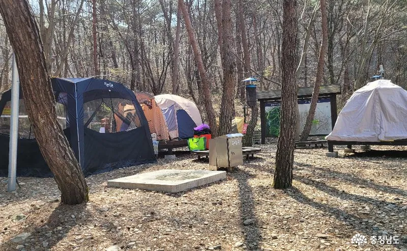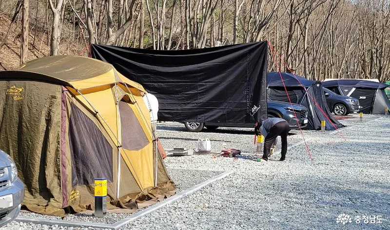 야영장은 10㎡ 넓이의 데크형 5개소와 35㎡ 넓이의 잔자갈이 깔린 자동차캠핑 15곳 등 모두 20개 사이트가 운영 중입니다. 전기가 사이트까지 들어오고 데크 옆으로 주차할 수 있어 편리합니다. 현재 야영장은 보강공사를 위해 휴장에 들어갔는데 6월에야 개장이 가능할 것으로 예측하는데 휴장기간이 공지가 되지 않아 아쉬움을 줍니다.(041-940-2727).