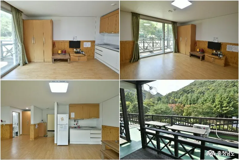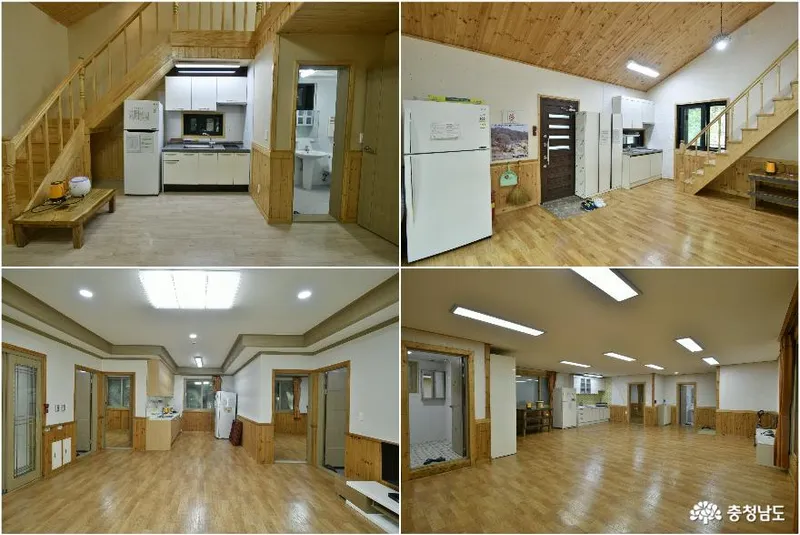 산책로의 주변으로는 숲속의집 12개가 독립적인 건물로 일정 간격을 두고 지어졌는데 4~15인실(31~84㎡)의 다양한 프라이빗 공간이 운영되고 있습니다. 8인실까지는 화장실이 1개라 아쉽지만, 주변에 공중화장실과 샤워장 등이 잘 갖춰져 있어 크게 불편하지는 않습니다. 일반적인 가전이 설치되어 있고 건물 앞까지 차를 가져갈 수 있는데다 주차 공간도 넉넉해 편리하게 사용할 수 있습니다.