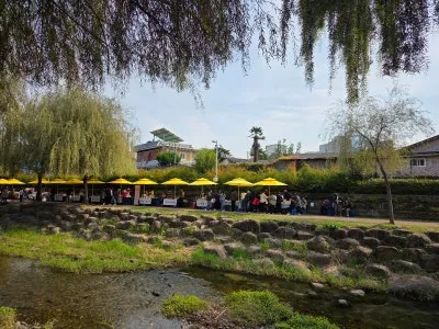 노란 파라솔 아래로 이어진 사람들의 웃음소리, 옆으로 흐르는 옥천변의 물소리,