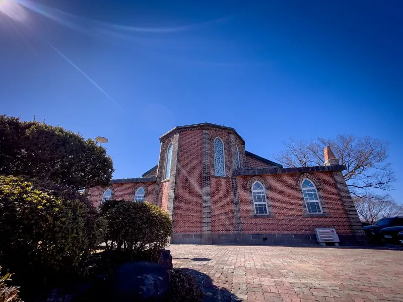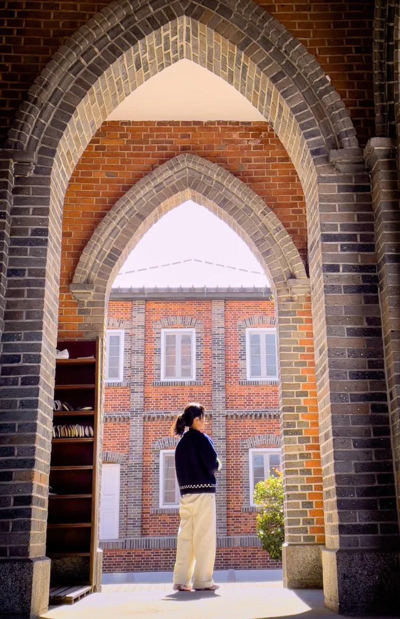 짙은 붉은색과 회색 벽돌이 잘 어우러집니다. 성당 건물 입구 쪽에 짧은 통로가 있는데, 이 곳에서 많은 분들이 인증샷을 찍는다고 해서 저도 찍어봤습니다. 여기선 가로 사진보다는 세로사진이 예쁘게 나오니 참고하시기 바랍니다.