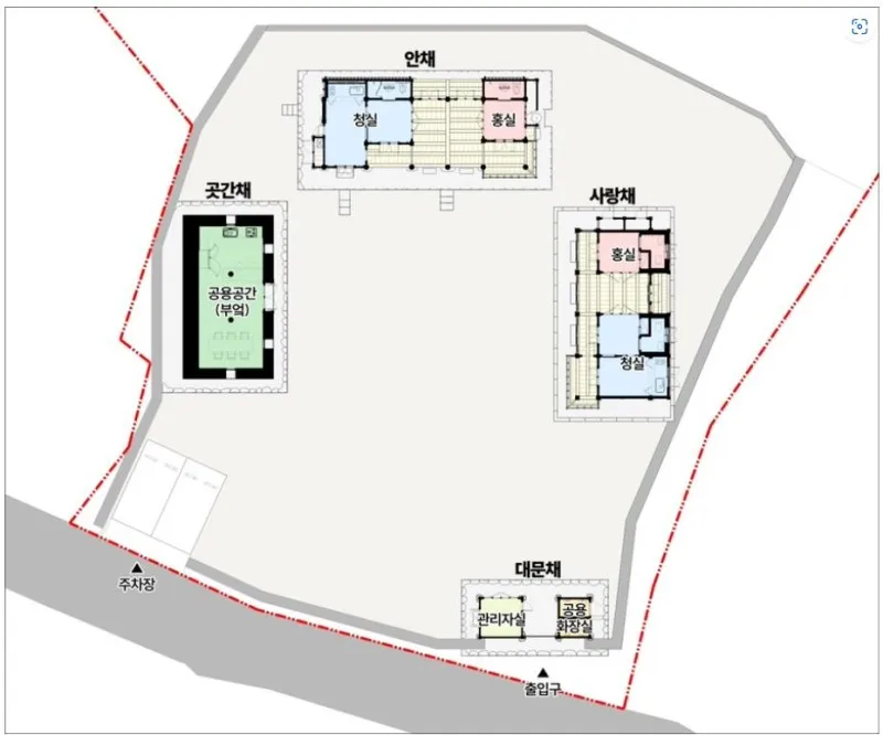 입구 맞은편으로 보이는 곳이 안채,