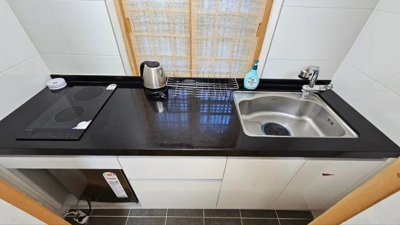 작은 냉장고와 전기포트, 싱크대가 갖춰져 있어요.