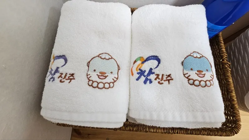 귀여운 하모캐릭터가 새겨진 새하얀 이불과 수건을 보니