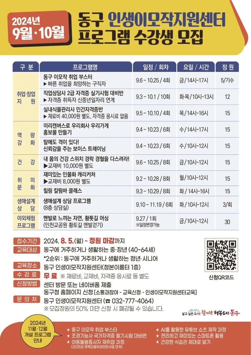 [동구소식] 인천 동구인생이모작지원센터, 9월~10월 프로그램 수강생 모집