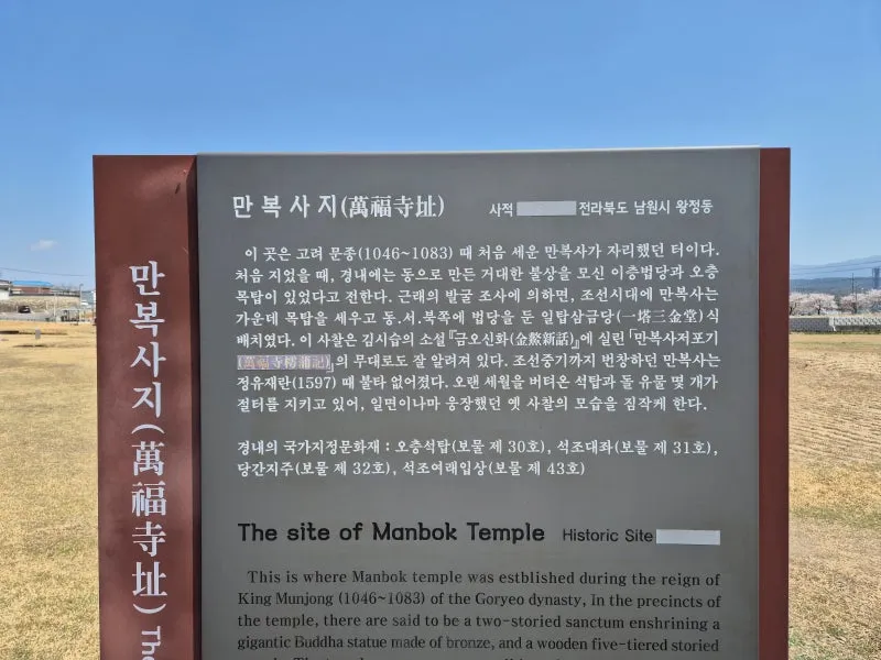 네, 바로 이곳이 만복사저포기가 태어난 萬福寺址입니다. 이 소설의 무대가 된 만복사는 고려 문종(1046~1084) 때 세워진 절로 정유재란(1597) 때 남원성이 함락되면서 소실된 절입니다. 지금은 석탑과 유물 몇 개만이 저 휑한 들녘에 남아 당시의 규모를 짐작게 할 뿐입니다.