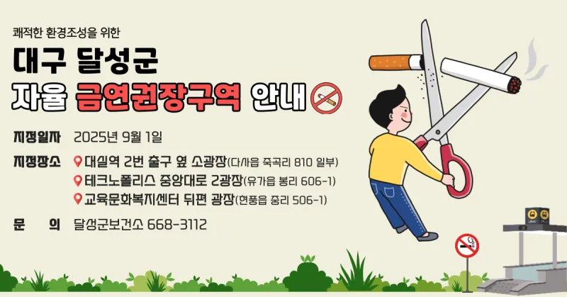 달성군이 9월 1일부로 유동인구가 많은 광장 3곳을 '자율 금연권장구역'으로 지정했습니다!