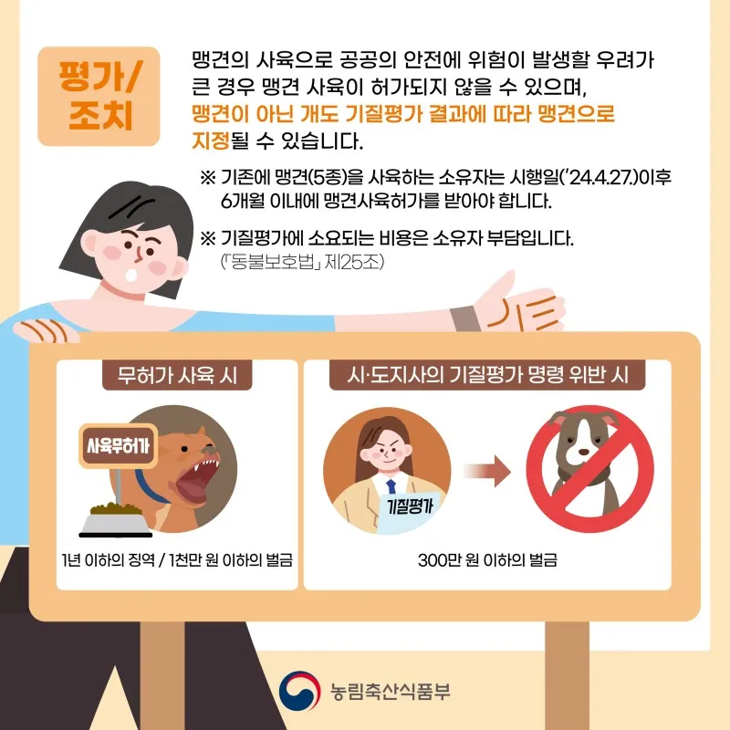 맹견 사육으로 공공의 안전에 위험이 발생할 우려가 큰 경우 맹견 사육이 허가되지 않을 수 있으며, 맹견이 아닌 개도 기질평가 결과에 따라 맹견으로 지정될 수 있습니다.