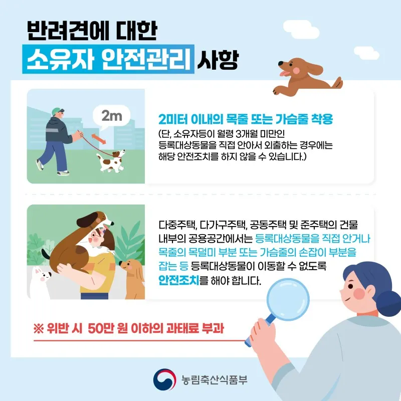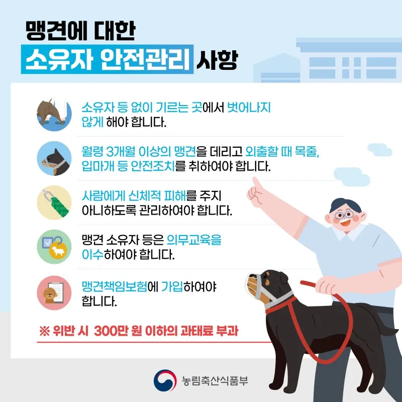 - 월령 3개월 이상의 맹견을 데리고 외출할 때 목줄, 입마개 등 안전조치를 취하여야 합니다.