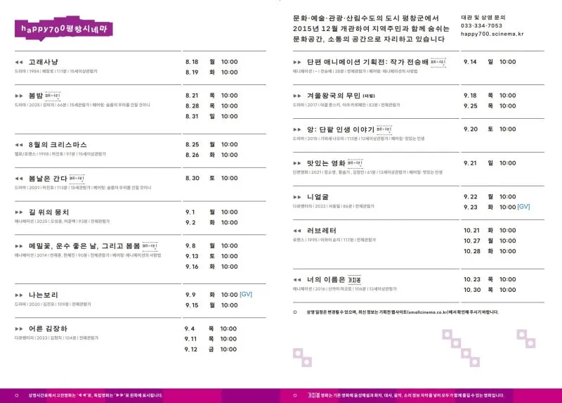 📍자세한 내용은 HAPPY700평창시네마 홈페이지(https://happy700.scinema.kr)에서 확인할 수 있으며, 문의 사항은 HAPPY700평창시네마(☎033-334-7053)로 연락하면 안내받을 수 있습다.