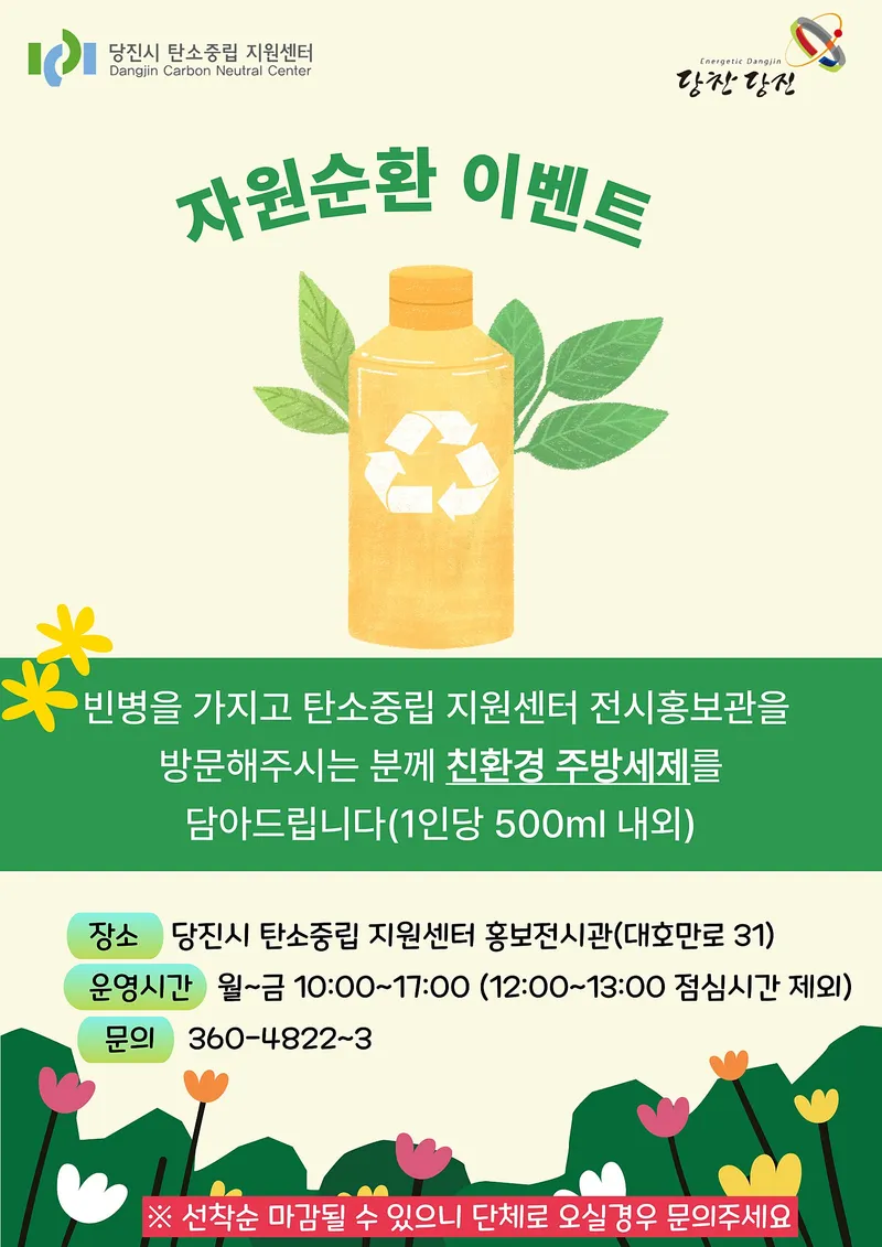 당진시 탄소중립 지원센터 홍보전시관 개관을 기념해 빈병을 가져온 방문객에게는 친환경 주방 세제를 담아주는 이벤트도 진행 중이라고 합니다. 연말까지 운영 예정이라고 하니 방학을 맞은 자녀들과 함께 방문해 보는 것도 좋을 것 같습니다.