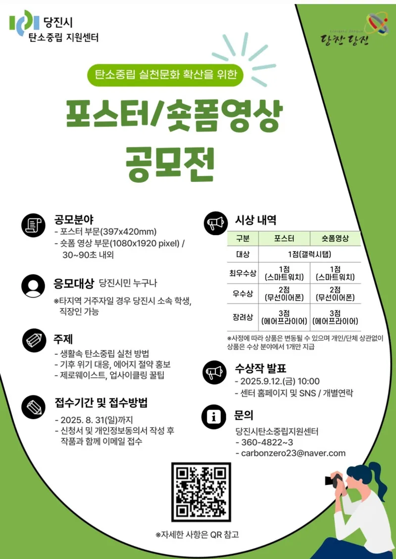 아울러 당진시 탄소중립 지원센터는 탄소중립 실천 문화 확산을 위한 포스터/숏폼 영상 공모전을 진행 중인데요. 당진시민(타 지역 거주자일 경우 당진시 소속 학생, 직장인 가능)을 대상으로 생활 속 탄소중립 실천 방법, 기후 위기 대응, 에너지 절약 홍보, 제로 웨이스트, 업사이클링 꿀팁 등을 담은 포스터와 숏폼을 만들어 8월 31일까지 제출하면 됩니다.