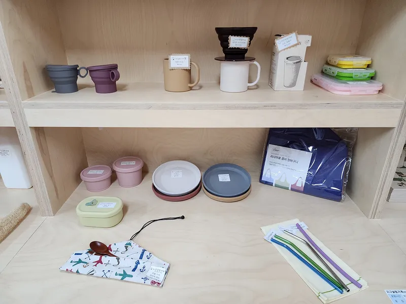 전시관에는 탄소중립 교육자료, 마을활동가 및 환경단체로부터 기증 또는 대여받은 업사이클링 작품, 탄소중립 보드게임, 제로 웨이스트 관련 물품 등이 전시되어 있습니다.