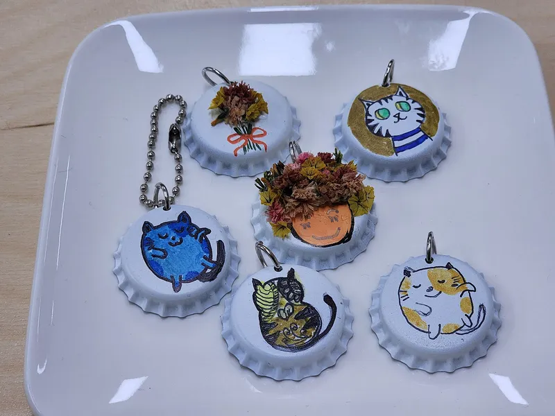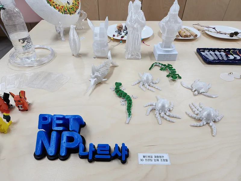 재활용을 통해 태어난 다양한 작품들이 눈길을 끌었는데요, 페트병을 재활용해 3D 프린팅 한 작품부터 시작해서 병뚜껑에는 귀여운 캐릭터들이 그려져 열쇠고리로 변신했습니다.