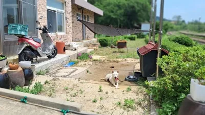 역내를 벗어나자 하얀 강아지와 마주했어요. 귀여운 희방사역 지킴이일까요? 처음에 멍멍 짖던 강아지가 무쇠달 다방 사장님의 한 마디에 금세 얌전해집니다.