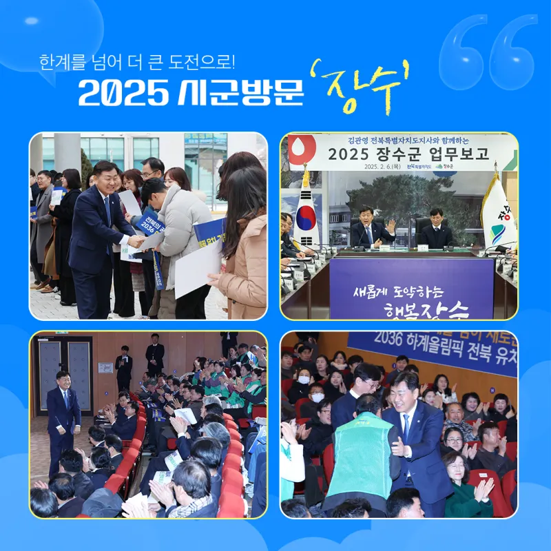 이에 전북도 는 “장수군이 가진 강점을 보전하고 발전시킬 수 있도록 전북특별자치도에서도 적극적으로 지원하겠다”고 전하며, 도민 행복을 위한 도전의 자세를 강조했습니다.