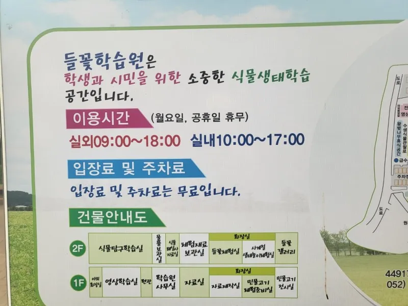 들꽃학습원은 월요일은 휴무이니 참고하시고 9:00부터 운영하니 너무 일찍가서 건물 안을 구경할 수 있는 기회를 놓치지 않길 바랍니다.