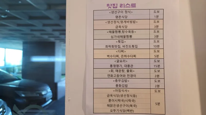 로비에는 근처 맛집 리스트(생선구이 정식,