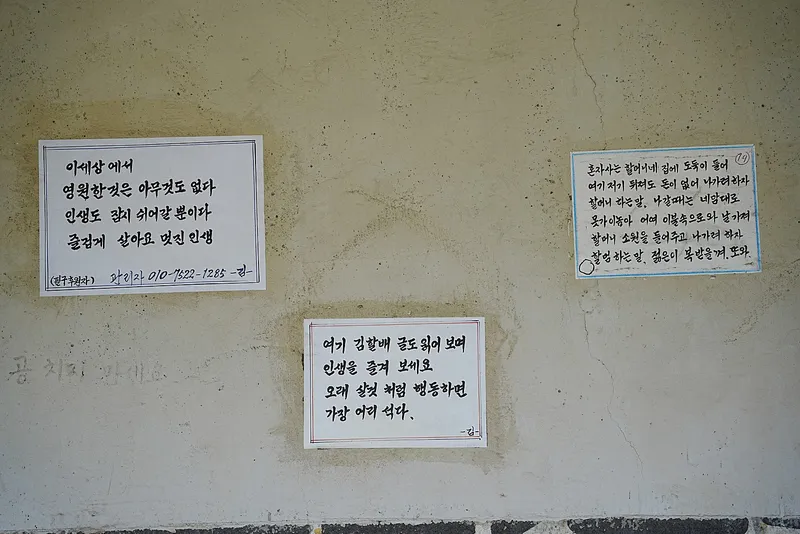 마음이 어수선할 때 한번 찾아가서 자신의 마음에 드는 글을 하나 찾아보세요. 수침교 다리 밑에서 살아갈 때 마음에 담아놓을 글귀 하나쯤은 분명 발견할 것입니다.