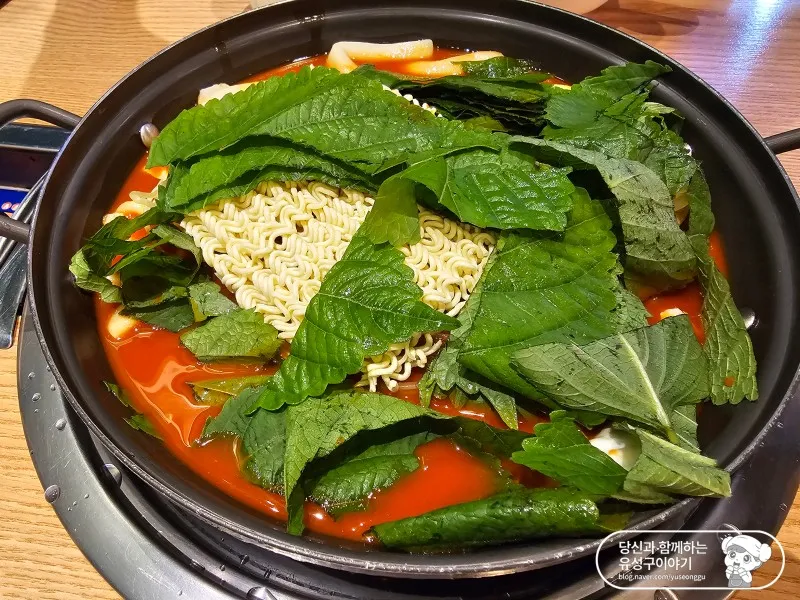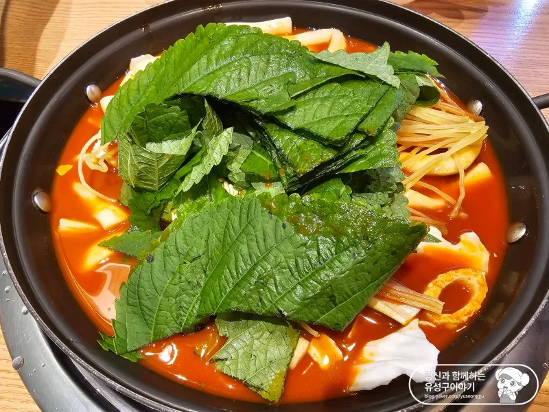 제가 주문한 즉석떡볶이 2인이 나왔습니다. 비 조리상태로 나오는 것이다 보니 생각보다 금방 나오더라고요. 한눈에 보아도 겹겹이 산처럼 쌓인 깻잎 조각이 너무 크고 많은 것은 아닌가 싶었는데 끓이고 나니 먹기 딱 좋게 쪼그라드는 거 있죠.
