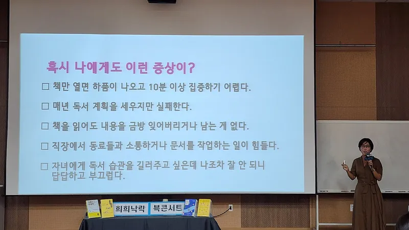 ◆김선영 작가의 '희희낙락 북콘서트' 포스터와 해돋이도서관 현장