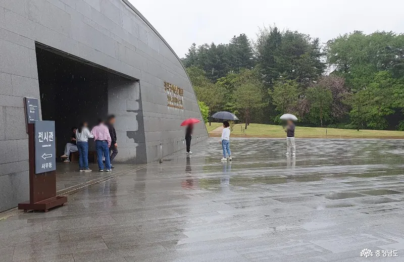 기념관 입구에서 기념 사진을 찍고 있는 방문객도 보입니다.