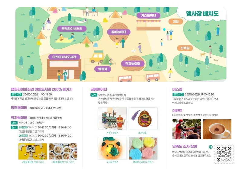야외도서관의 체험과 이벤트를 200% 즐기셨다면, 다음에도 더 좋은 프로그램을 위해 만족도 조사에 꼭 참여해주세요!