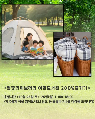 ✅ 이번 주말, 이진아기념도서관 앞마당에서 책과 함께하는 가을 캠핑! 잊지 못할 추억을 만들어가시길 바랍니다! 😊