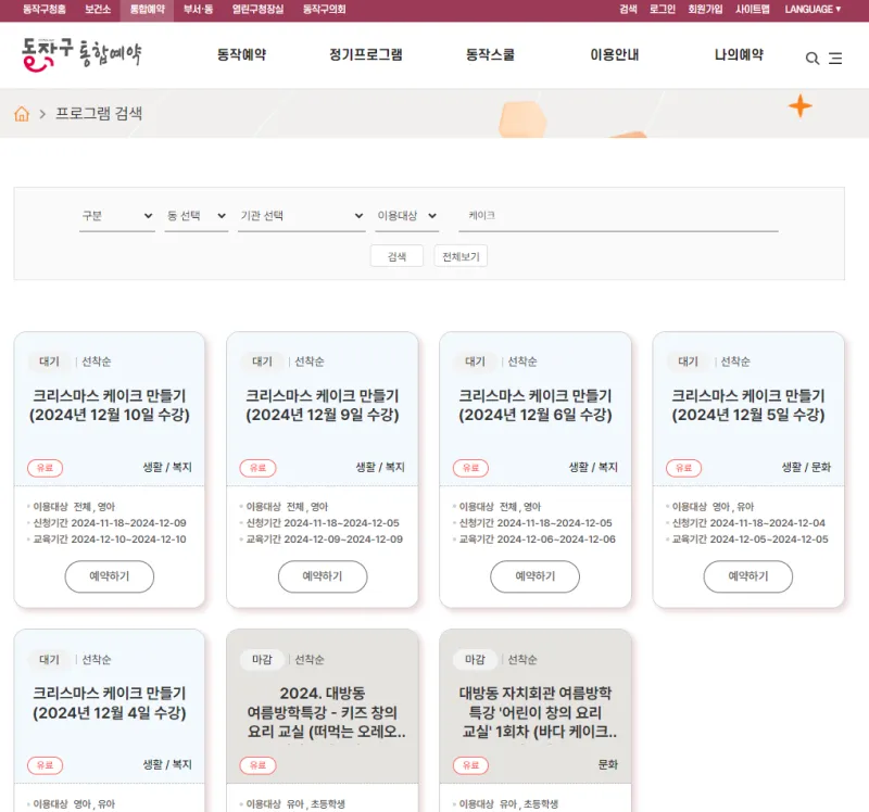 ① 구 홈페이지 > (상단) 통합예약 > (검색창) "케이크" 검색 > 예약하기