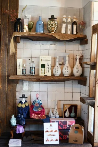 한옥 카페 볕은 박재서 안동 소주가 진열되어 있습니다.
