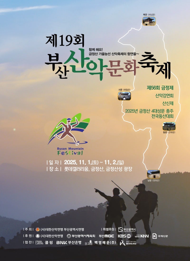제19회 부산산악문화축제 ◾ 기간 : 2025.11.1.(토)~11.2.(일) ◾ 장소 : 롯데갤러리움, 금정산성 광장, 금정산 일원 ◾ 종목 : 등산 |