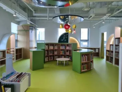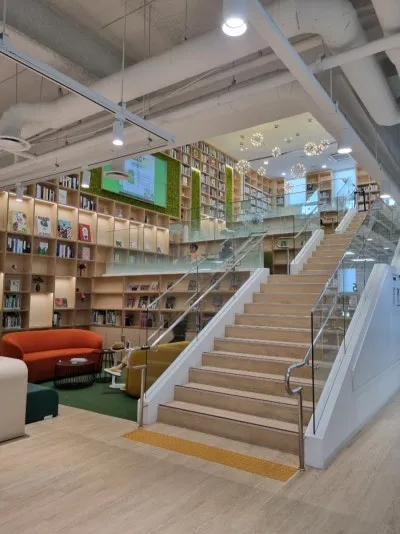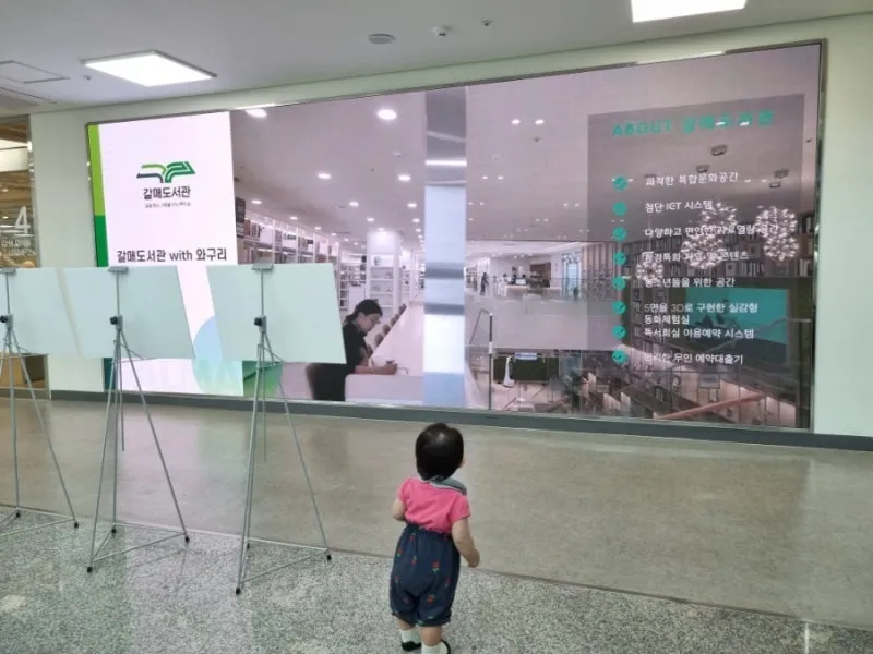 아이는 로비 전면에 펼쳐진 갈매 도서관